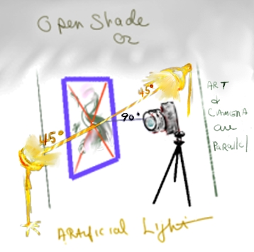 Natural light: When lighting the art work the best light for a flat piece of art work is flat light, that is, light with no contrast. An easy way to accomplish this is to use flat light during a cloudy day or in the shadows on a sunny day. If you have the option on your camera to set the color balance for “cloudy” do so. Even so, the color of the above described light might cause a color shift on the art work that will have to be corrected with photo software later on.