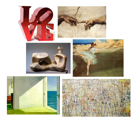 Robert Indiana, Love, 1928; Michelangelo, Sistine Chapel detail, The Creation of Adam, 1508-1512;Henry Moore, Reclining figure, 1957-58; Edgar Degas, The Star Dancer on Point, c 1878-80; Edward Hopper, Two Rooms by the Sea, 1951; Ben Shahn, Still Music, 1848 |